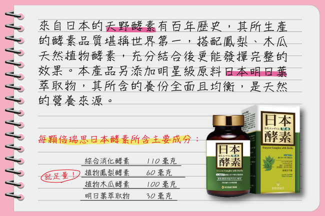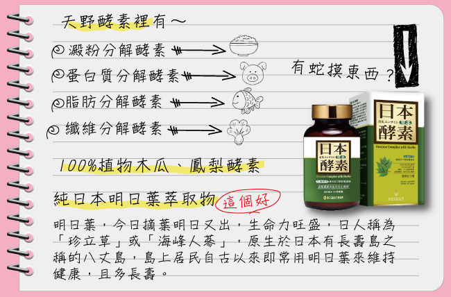 ■商品成分:天野綜合消化酵素(含澱粉酵素、蛋白酵素、脂解酵素、纖維素分解酵素等30多種酵素)、鳳梨酵素、木瓜酵素、明日葉萃取物 。