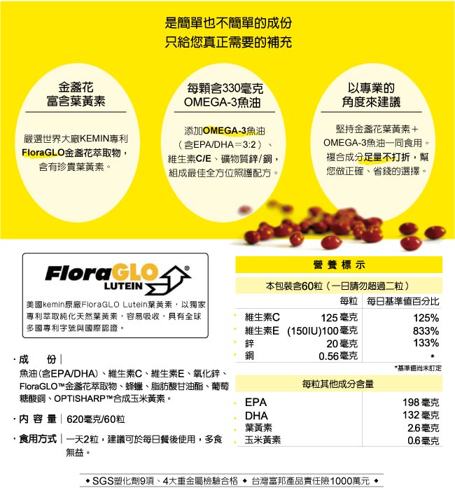 ■商品成分:魚油(含EPA/DHA)、維生素C、維生素E、氧化鋅、FloraGLO金盞花萃取物、蜂蠟、脂肪酸甘油酯、葡萄糖酸銅、OPTISHARP合成玉米黃素